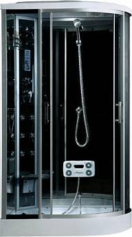 Акриловый поддон h - 15 см. с сифоном и усиленным каркасом. Анодированный алюминиевый профиль (матовый хром). Закаленное ударопрочное безопасное стекло толщиной 5 мм. Сенсорный пульт управления. Подсветка верхняя и боковая. FM-радио. Вентиляция. Смеситель однорычажный - четыре режима. Тропический душ. Лейка. Массажер ступней. Гидромассаж спины 6 джет. Двойные ролики. Стеклянная полочка. Откидное сиденье с допустимой нагрузкой не более 50 кг. Диспенсер. Ручки.