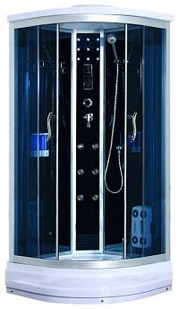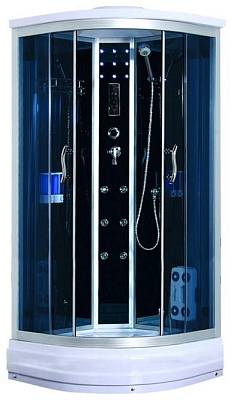 Акриловый поддон h - 15 см. с сифоном и усиленным каркасом.  Анодированный алюминиевый профиль (матовый хром). Закаленное ударопрочное безопасное стекло толщиной 5 мм. Сенсорный пульт управления. Подсветка верхняя и боковая. FM-радио. Вентиляция. Смеситель однорычажный - четыре режима. Тропический душ. Лейка. Массажер ступней. Гидромассаж спины 6 джет. Двойные ролики. Стеклянная полочка. Откидное сиденье с допустимой нагрузкой  не более 50 кг. Диспенсер. Ручки.