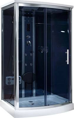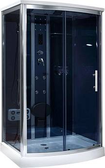 Акриловый поддон h - 15 см. с сифоном и усиленным каркасом. Анодированный алюминиевый профиль (матовый хром). Закаленное ударопрочное безопасное стекло толщиной 5 мм. Сенсорный пульт управления. Подсветка верхняя и боковая. FM-радио. Вентиляция. Смеситель однорычажный - четыре режима. Тропический душ. Лейка. Массажер ступней. Гидромассаж спины 6 джет. Двойные ролики. Стеклянная полочка. Откидное сиденье с допустимой нагрузкой не более 50 кг. Диспенсер. Ручки.