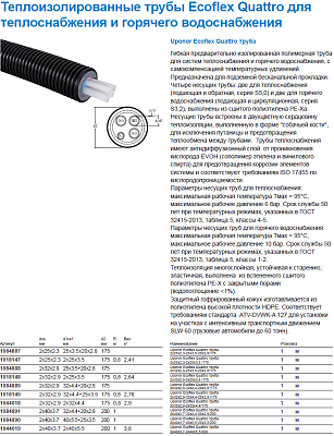 1018149 Uponor Ecoflex Quattro труба 2x32x2,9-32x4,4-25x3,5/175 Гибкая предварительно изолированная полимерная труба для систем теплоснабжения и горячего водоснабжения по ТУ 2248-001-27431685-2015 и EN 15632-3, с самокомпенсацией температурных удлинений. Предназначена для подземной бесканальной прокладки. Четыре несущих трубы: две для теплоснабжения (подающая и обратная, серия S5,0) и две для горячего водоснабжения (подающая и циркуляционная, с...