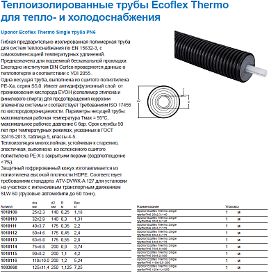 1018112 Uponor Ecoflex Thermo Single труба PN6 50x4,6 /175 Гибкая предварительно изолированная полимерная труба для систем теплоснабжения по ТУ 2248-001-27431685-2015 и EN 15632-3, с самокомпенсацией температурных удлинений. Предназначена для подземной бесканальной прокладки. Ежегодно институтом DIN Certco проверяются данные о теплопотерях в соответствии с VDI 2055. Одна несущая труба, выполнена из сшитого полиэтилена РЕ-Ха, серия S5,0. Имеет ...