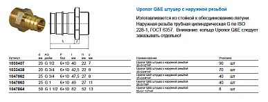 Изготавливается из стойкой к обесцинкованию латуни. Наружная резьба трубная цилиндрическая G по ISO 228-1, ГОСТ 6357. Внимание: кольцо Uponor Q&E следует заказывать отдельно!