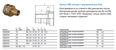 1023012 Uponor Q&E штуцер с внутренней резьбой 25-Rp3/4“ВР Изготавливается из стойкой к обесцинкованию латуни. Внутренняя резьба трубная цилиндрическая Rp по DIN EN 10226-1, ГОСТ 6211. Внимание: кольцо Uponor Q&E следует заказывать отдельно!