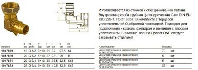 1047882 Uponor Q&E угольник с накидной гайкой 25-G3/4“НГ Изготавливается из стойкой к обесцинкованию латуни. Внутренняя резьба трубная цилиндрическая G по DIN EN ISO 228-1, ГОСТ 6357. В комплекте с торцевой уплотнительной О-образной прокладкой. Подходит для подключения к кранам, фильтрам и вентилям с плоским уплотнением. Внимание: кольцо Uponor Q&E следует заказывать отдельно!