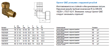 1023022 Uponor Q&E угольник с наружной резьбой 25-G3/4“HP Изготавливается из стойкой к обесцинкованию латуни. Наружная резьба трубная цилиндрическая G по ISO 228-1, ГОСТ 6357. Внимание: кольцо Uponor Q&E следует заказывать отдельно!