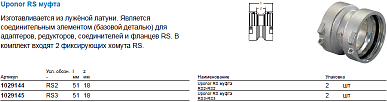 1029145 Uponor RS муфта RS3-RS3 Изготавливается из лужёной латуни. Является соединительным элементом (базовой деталью) для адаптеров, редукторов, соединителей и фланцев RS. В комплект входят 2 фиксирующих хомута RS.