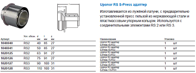 1029128 Uponor RS S-Press адаптер 110-RS3 Изготавливается из лужёной латуни, с предварительно установленной пресс гильзой из нержавеющей стали и пластмассовым упорным кольцом. Используется с соединительными элементами RS 2 или RS 3.