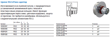 1029121 Uponor RS S-Press адаптер 25-RS2 Изготавливается из лужёной латуни, с предварительно установленной алюминиевой пресс гильзой и пластмассовым упорным кольцом. Имеет функции: идентификация опрессовки, цветовая кодировка, защита от протечки. Не требуется калибровка. Используется с соединительными элементами RS 2.