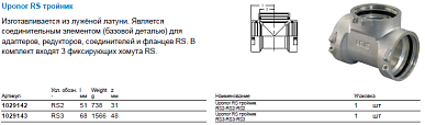 1029142 Uponor RS тройник RS2-RS2-RS2 Изготавливается из лужёной латуни. Является соединительным элементом (базовой деталью) для адаптеров, редукторов, соединителей и фланцев RS. В комплект входят 3 фиксирующих хомута RS.