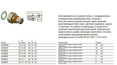 1015297 Uponor S-Press штуцер с накидной гайкой 25-G1“НГ Изготавливается из лужёной латуни, с предварительно установленной алюминиевой пресс гильзой и пластмассовым упорным кольцом. Имеет функции: идентификация опрессовки, цветовая кодировка, защита от протечки. Не требуется калибровка. В комплекте с торцевой герметизирующей прокладкой. Подходит для подключения к кранам, фильтрам и вентилям с плоским уплотнением. Внутренняя резьба трубная цилиндрическая G по DIN EN ISO 228-1, ГОСТ 6357.
