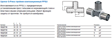 1022721 Uponor S-Press тройник равнопроходной композиционный PPSU 32-32-32 Изготавливается из PPSU, с предварительно установленными пресс гильзами из нержавеющей стали и пластмассовыми упорными кольцами. Имеет функцию защиты от протечки. Не требуется калибровка.