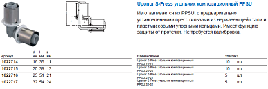 1022716 Uponor S-Press угольник композиционный PPSU 25-25 Изготавливается из PPSU, с предварительно установленными пресс гильзами из нержавеющей стали и пластмассовыми упорными кольцами. Имеет функцию защиты от протечки. Не требуется калибровка.