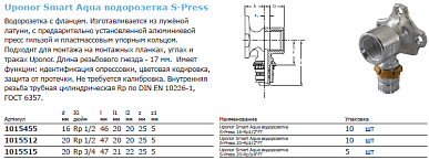 1015512 Uponor Smart Aqua S-Press водорозетка 20-Rp1/2“ВР Водорозетка с фланцем. Изготавливается из лужёной латуни, с предварительно установленной алюминиевой пресс гильзой и пластмассовым упорным кольцом. Подходит для монтажа на монтажных планках, углах и траках Uponor. Длина резьбового гнезда - 17 мм. Имеет функции: идентификация опрессовки, цветовая кодировка, защита от протечки. Не требуется калибровка. Внутренняя резьба трубная цилиндрическая R...