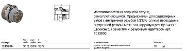 Изготавливается из покрытой латуни, самоуплотняющийся. Предназначен для радиаторных узлов с внутренней резьбой 1/2“ВР, служит переходом с внутренней резьбы 1/2“ВР на наружную резьбу 3/4“НР Евроконус, совместим с резьбовым адаптером арт. 1013830.
