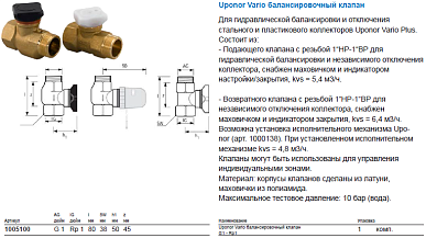 1005100 Uponor Vario балансировочный клапан для коллекторов G1-Rp1, комплект Для гидравлической балансировки и отключения стального и пластикового коллекторов Uponor. Состоит из: - Подающего клапана с резьбой 1“НР-1“ВР для гидравлической балансировки и независимого отключения коллектора, снабжен маховичком и индикатором настройки/закрытия, kvs = 5,4 м³/ч. - Возвратного клапана с резьбой 1“НР-1“ВР для независимого отключения коллекто...