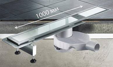 Душевой лоток в комплекте с сифоном и ножками под плитку. Длинна: 1000 мм. Материал: металл. Высота от 90 до 150 мм. Пропускная способность по DIN EN 274, от 0,5 л/сек. до 0,7 л/сек. В комплект входит: Опоры, сифон, гидрозатвор и съемный грязеуловитель, компенсатор по высоте Уплотнительный фланец с песчаной посыпкой.