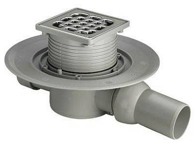 поворотная и регулируемая по высоте насадка 100x100 мм, рамка для установки решетки сделана из пластика, заглушка, штампованная решетка из нержавеющей стали 1.4301, фланец для нанесения/закрепления гидроизоляции, съемное устройство для защиты от неприятного запаха из системы канализации, ввод для подключения дополнительных сантехприборов DN40, выпуск на шарнирном соединении