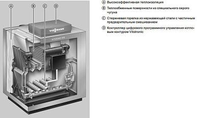 Viessmann Vitogas 100 KC4 GS1D115 чугунный газовый котел с атмосферной горелкой. Один из наиболее экономичных и высокопроизводительных напольных котлов. Он надежен в работе и имеет долгий срок службы. Благодаря небольшим габаритным размерам котел подходит для монтажа даже в небольших подсобных помещениях. Котел Vitogas 100 отличается экономичностью при сжигании газового топлива. Кроме того, благодаря атмосферной горелке с предварительным смешением из нержавеющей стали гарантируется минимизация выбросов вредных веществ.